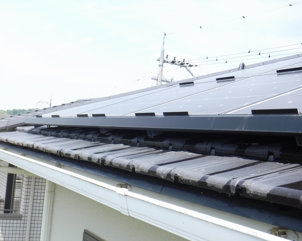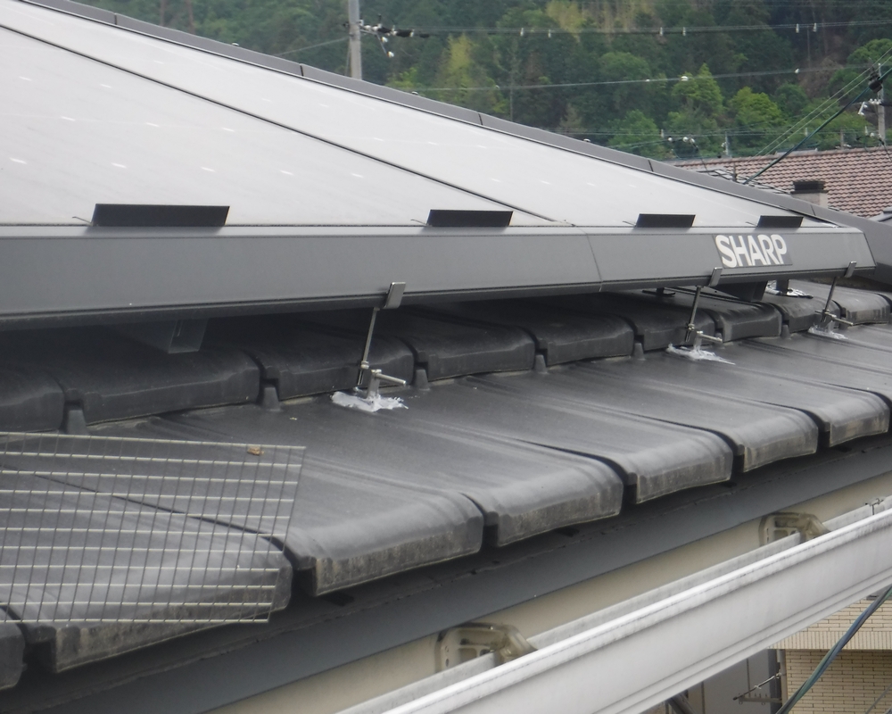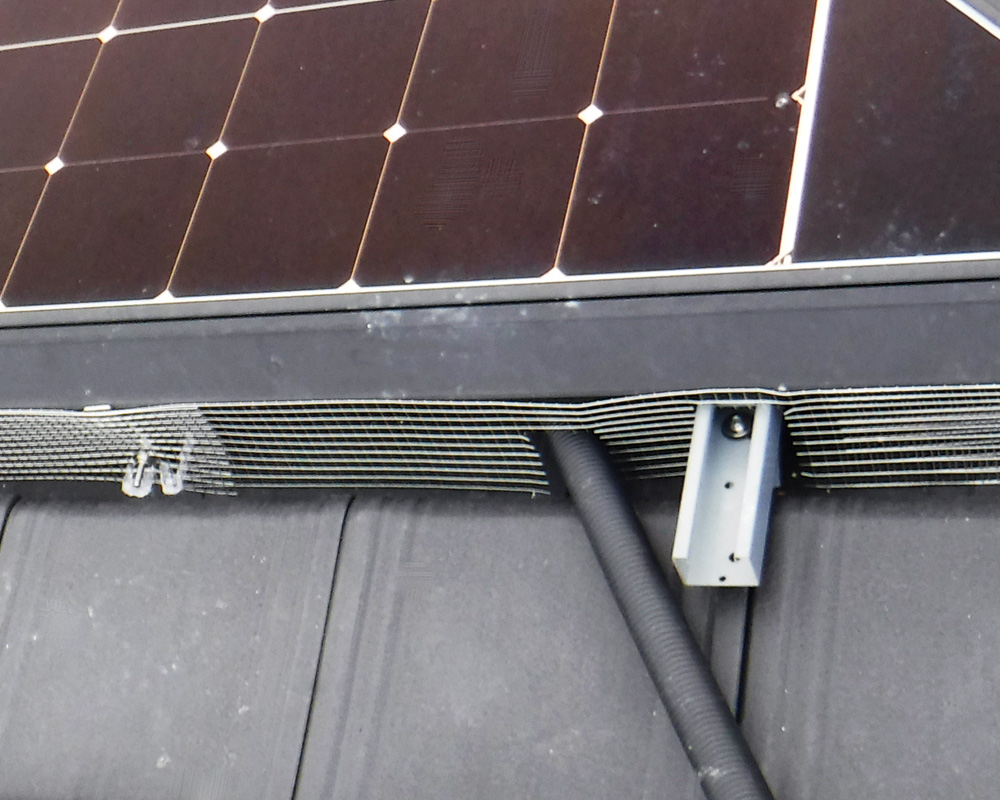 こちらの住宅は森や田園に囲まれており、トンビやカラス、ハト、スズメなど色々な鳥が飛び交う地域。去年の秋頃からハトが太陽光パネルの隙間をねぐらにしている様子。対策としてバードブロッカーを設置。